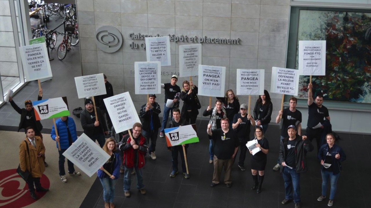 La Fédération de la relève agricole du Québec (FRAQ) s’est mobilisée à Montréal pour lancer un message clair à la Caisse de dépôt et placement du Québec (CDPQ) et au Fonds de solidarité de la FTQ : Pas question d’injecter notre argent public dans Pangea. Après avoir tenu une conférence de presse à la Maison du développement durable aux côtés de L’Union des producteurs agricoles (UPA) et la Fondation David-Suzuki, une trentaine de membres de la relève se sont déplacés vers la CDPQ et ont investi l’établissement pour sensibiliser la population à l’urgence de la situation. Devant la concurrence déloyale de certains fonds d’investissement, il y a un danger imminent pour notre garde-manger. Les producteurs agricoles du Québec sont les gardiens de notre sécurité alimentaire et il faut agir pour contrer le phénomène de surenchère sur le prix des terres.