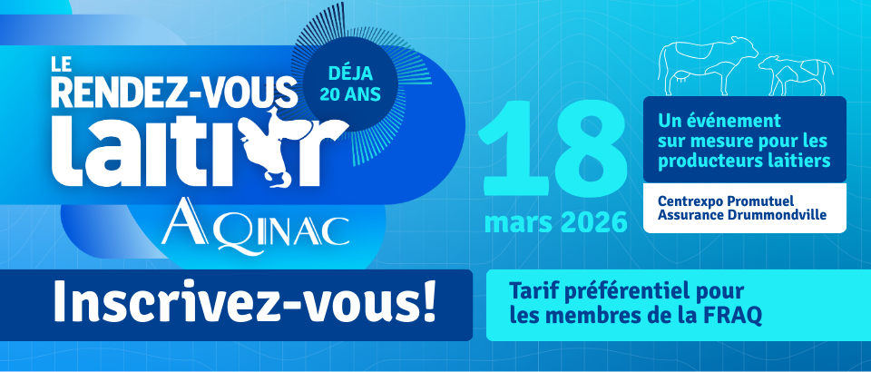 L’Association québécoise des industries de nutrition animale et céréalière (AQINAC) t’invite le 18 mars prochain au Centrexpo Promutuel Assurance de Drummondville pour la 20e édition du Rendez-vous laitier AQINAC. ![]()