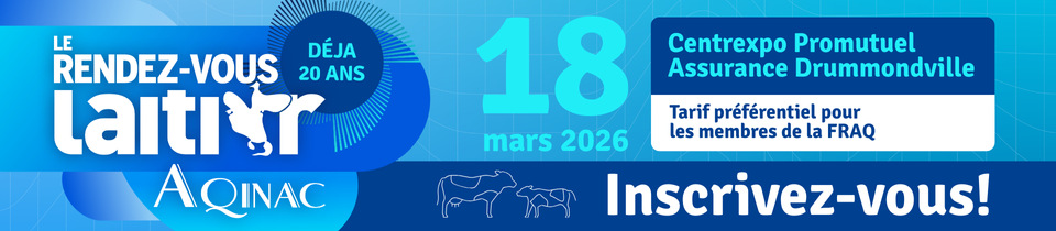 L’Association québécoise des industries de nutrition animale et céréalière (AQINAC) t’invite le 18 mars prochain au Centrexpo Promutuel Assurance de Drummondville pour la 20e édition du Rendez-vous laitier AQINAC. ![]()